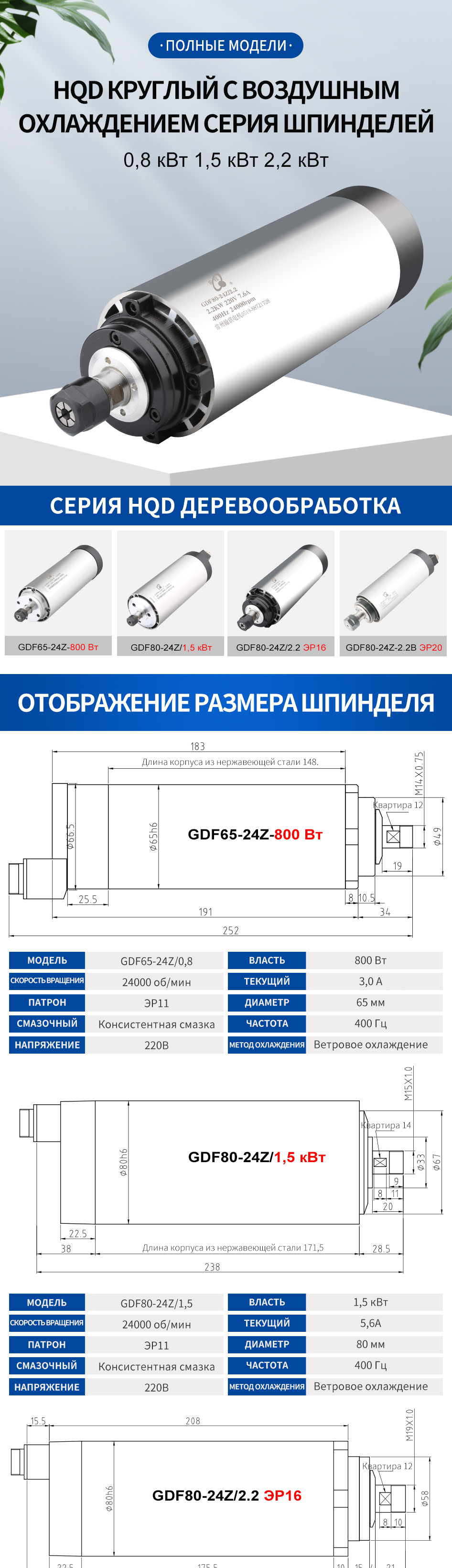Qiancheng Hanqi HQD круглый шпиндель с воздушным охлаждением 0,8 кВт/1,5 кВт/2,2 кВт рекламный дерев