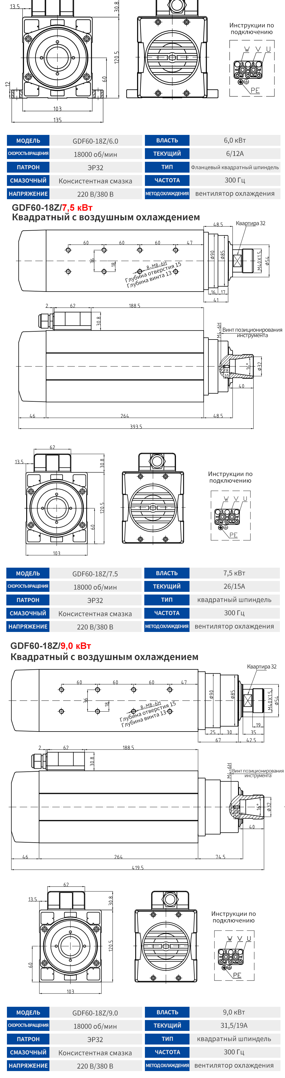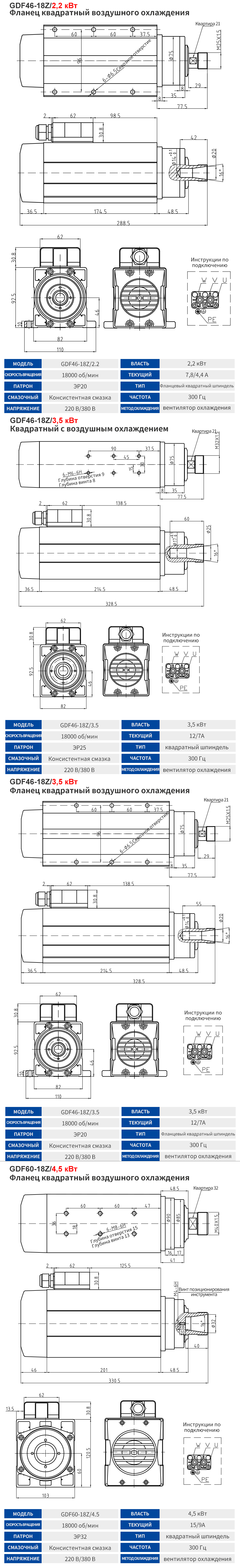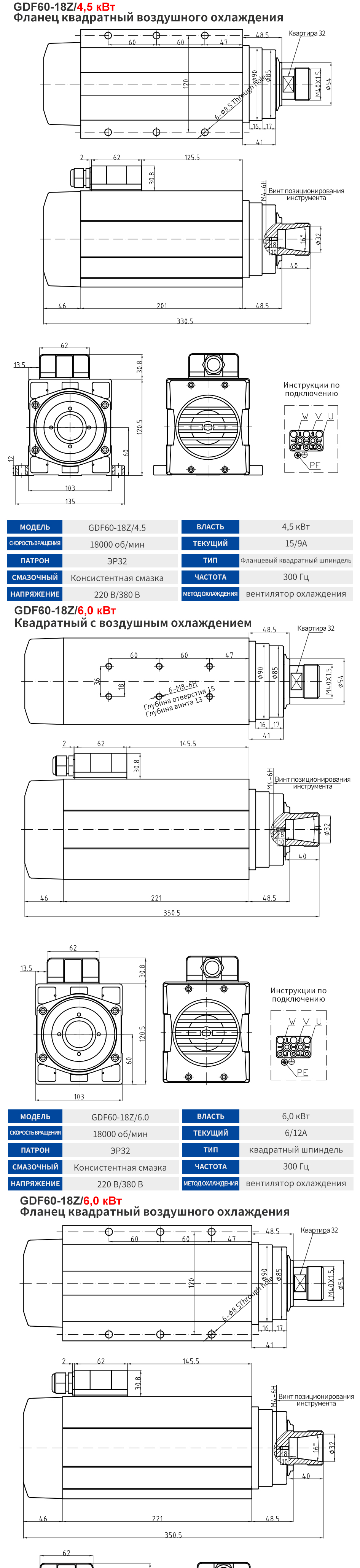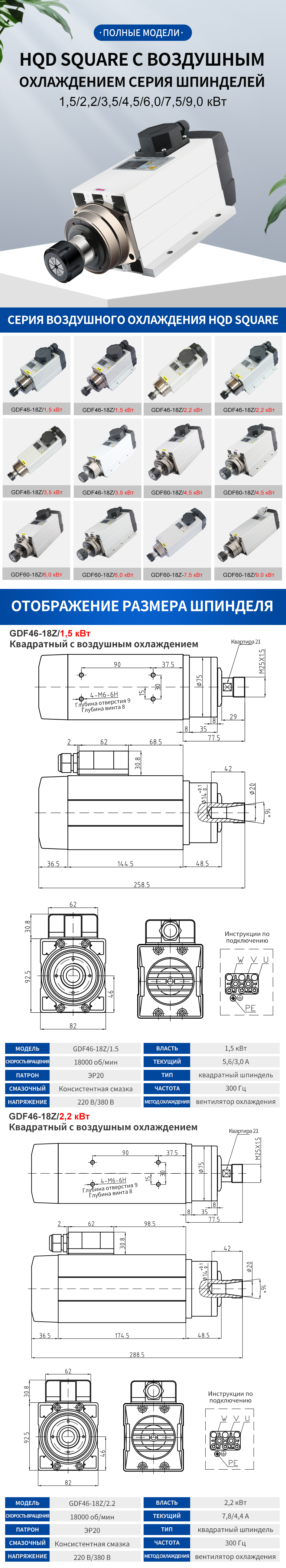 HQD квадратный шпиндель с воздушным охлаждением, серия 1,5–9 кВт