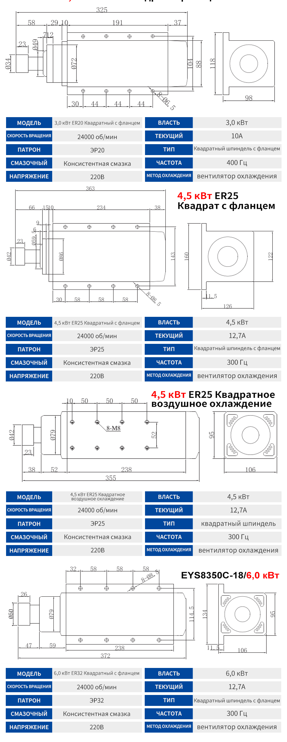 Чанчуань квадратный шпиндель с воздушным охлаждением серии 2,2 кВт-6,0 кВт