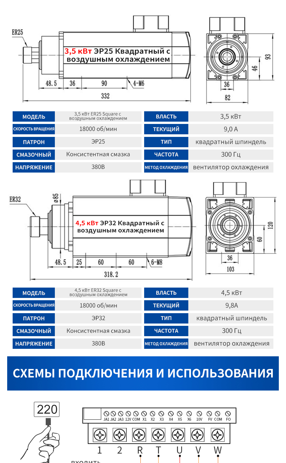 Квадратный шпиндель Shuntong с воздушным охлаждением, серия 2,2-6,0 кВт